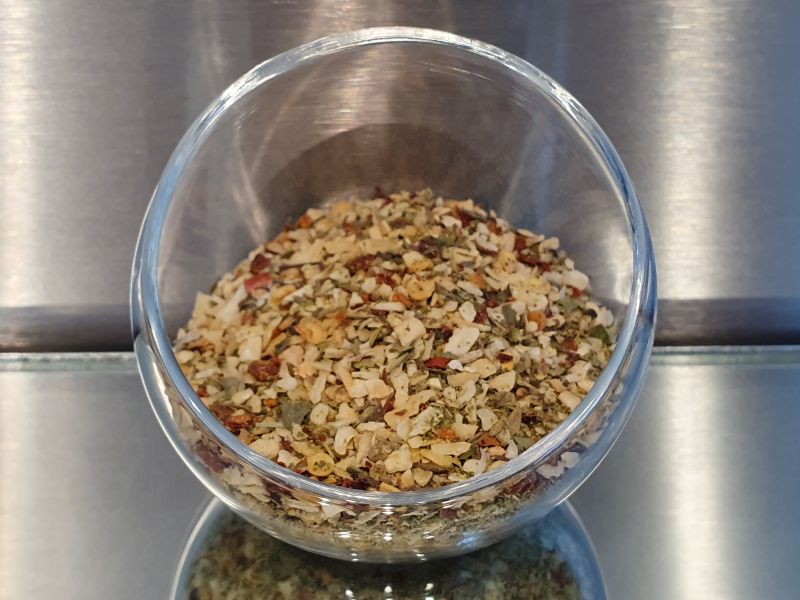 Gewürze: (Zwiebel, Knoblauch, Chili, Petersilie, Paprika, Basilikum, Oregano, Thymian, Bockshornklee, Estragon), Speisesalz, Käsepulver¹ 4% (Milch, Käsekulturen), Pflanzenfett (Palm, Sonnenblume), Dextrose, hydrolysiertes Pflanzenprotein (Mais, Raps), modifizierte Maisstärke.