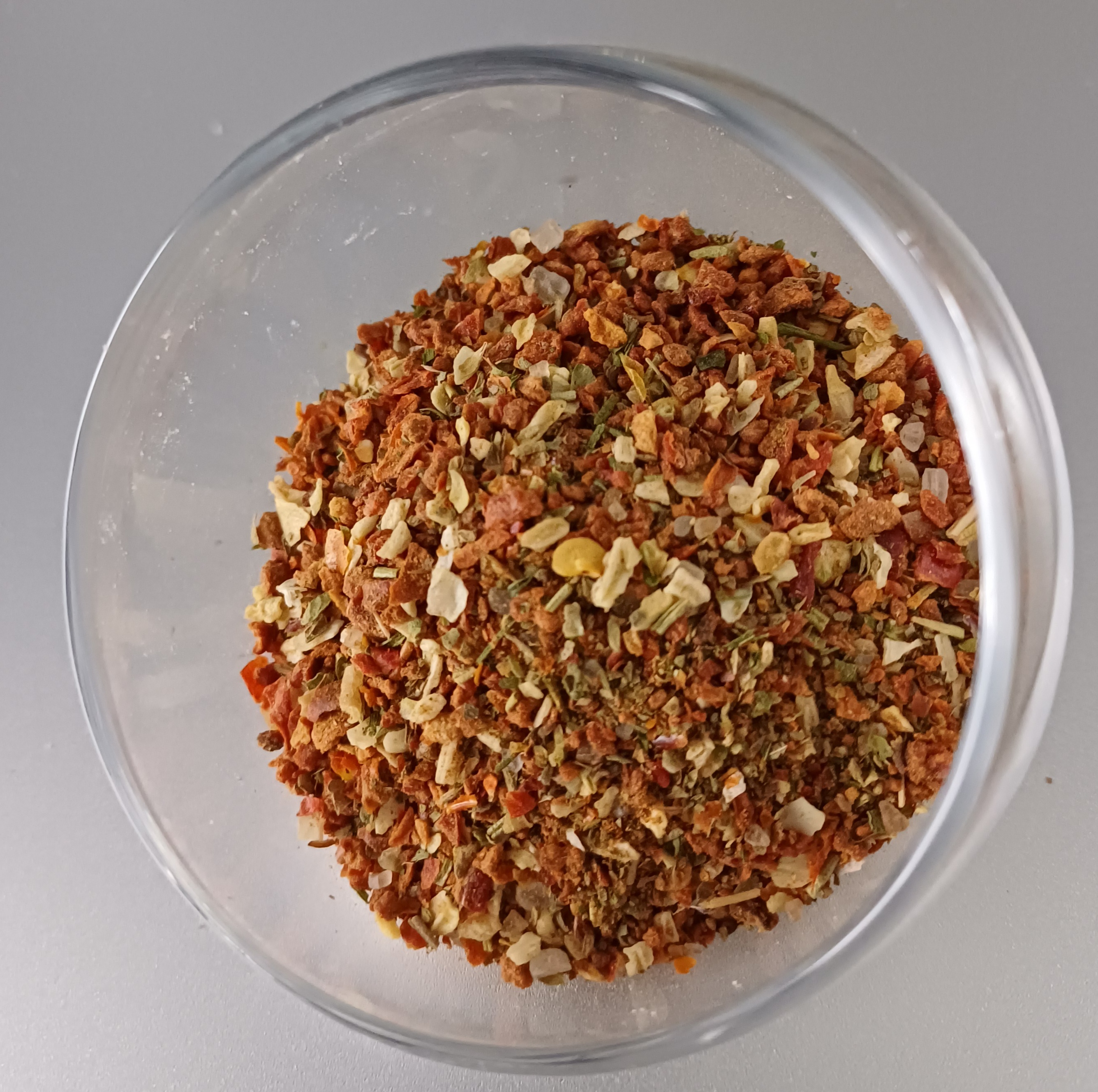 Gewürzzubereitung - Zutaten: Paprikaflocken, Zwiebel, Meersalz, Tannenrauchsalz, Oregano, Chili, Basilikum, Rosmarin, Petersilienblätter, Majoran, Muskatnuss