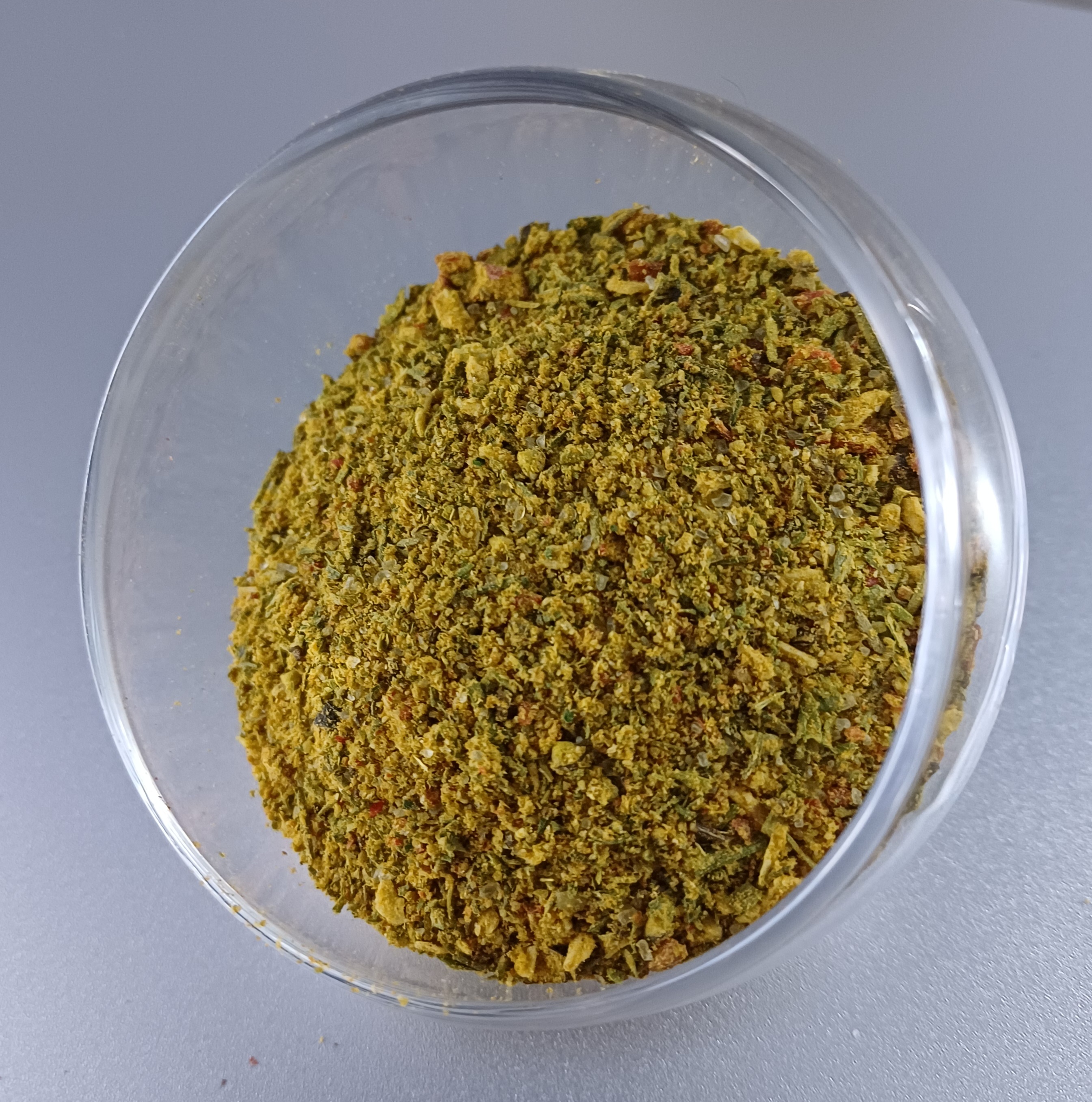 Zutaten: Meersalz, Pfeffer, Paprika, Zwiebel, Senfmehl, Curry (Kurkuma, Zwiebel, Knoblauch, Senf, Chili, Koriander, Cumin, Ingwer, Bockshornkleesaat, Pfeffer, Salz, Fenchel, modifizierte Stärke, Schnittlauch, Kurkuma, Thymian, Petersilie, Knoblauch, Aroma (Gerste, Weizen), Muskatnuss, Sonnenblumenöl, Salzgehalt 25%.